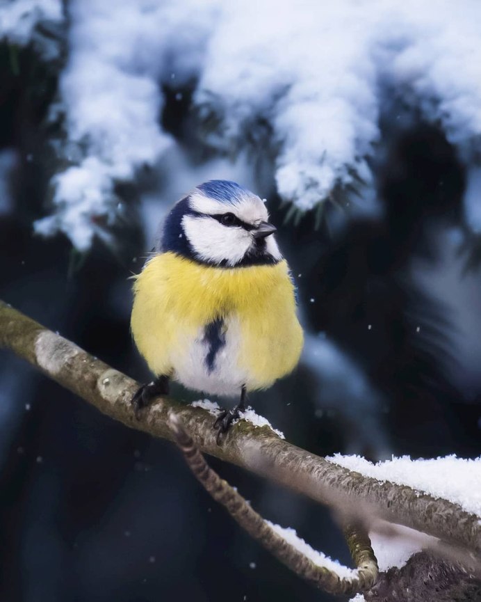 Синица на заснеженной ветке елки