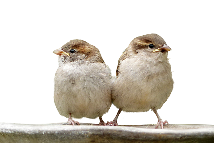 Воробей с птенцом на белом фоне