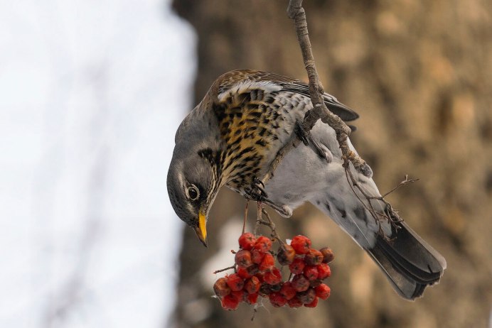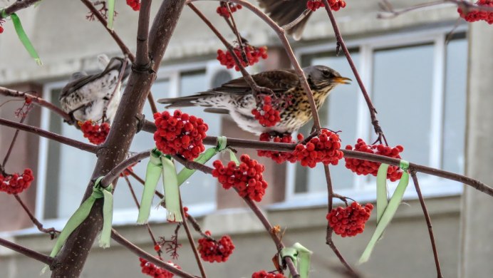 Птицы на рябине зимой Дрозд рябинник