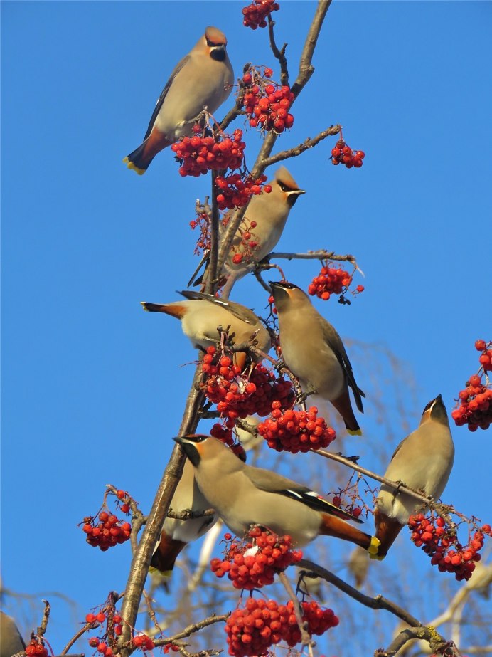 Стая свиристелей на рябине