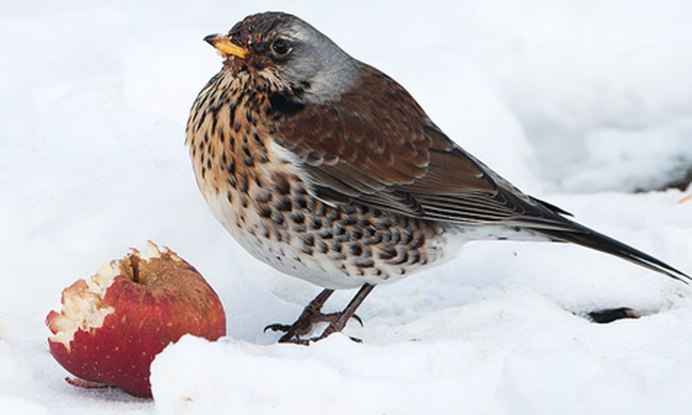 Дрозд рябинник клюет яблок.
