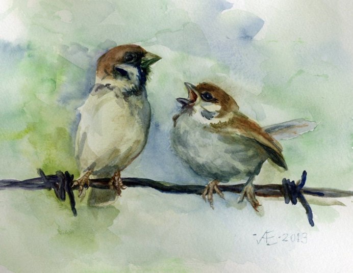 Воробей акварелью