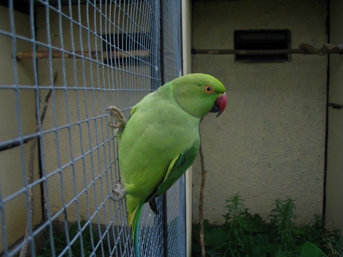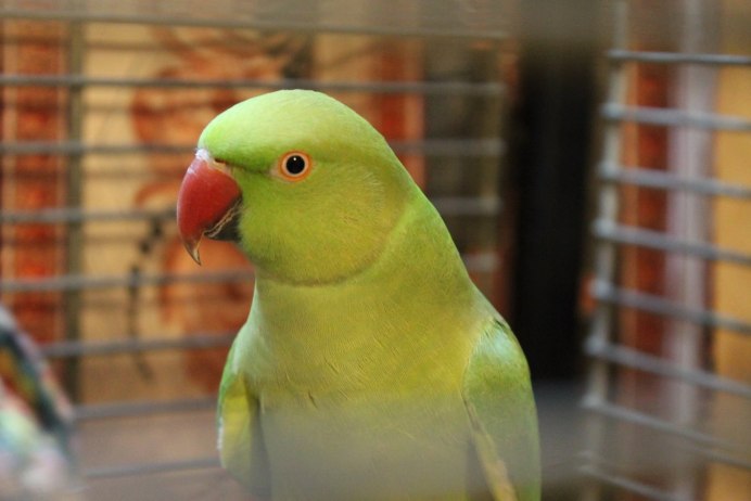 Ожереловый попугай в клетке