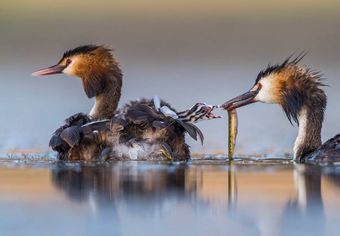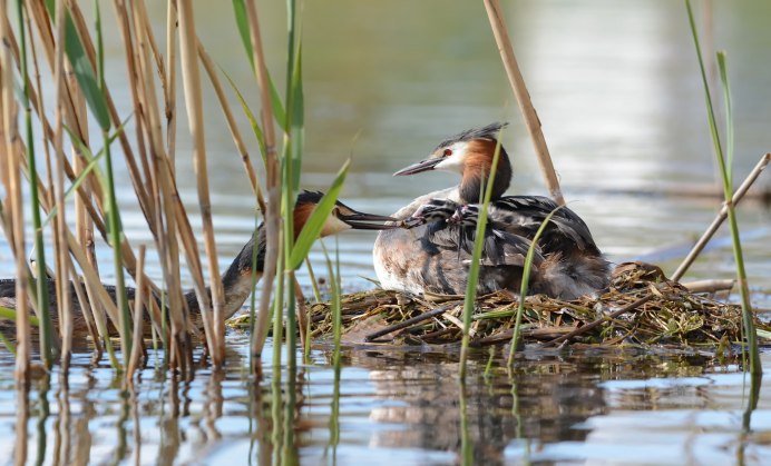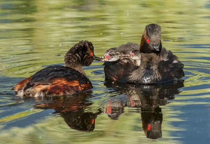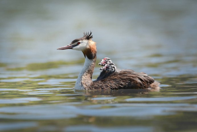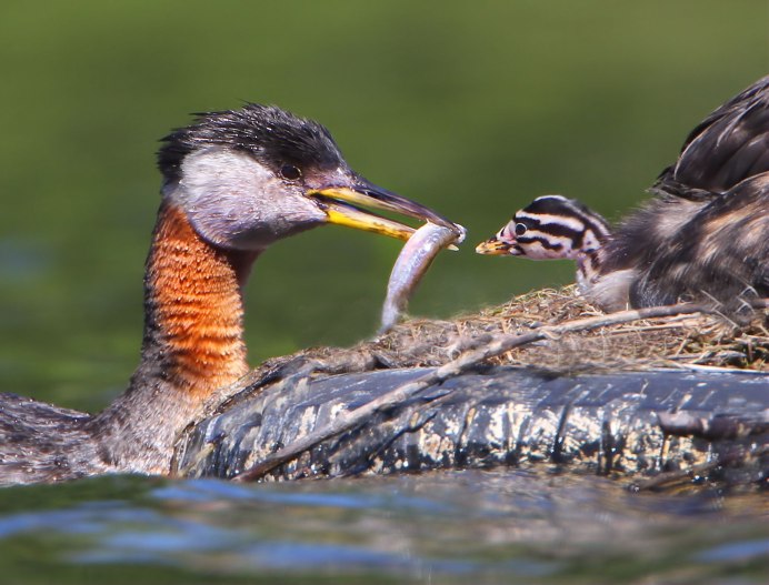 Утка чомга кормит птенцов