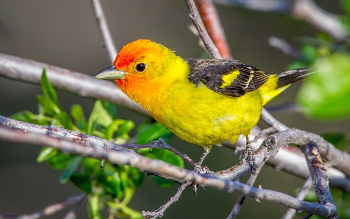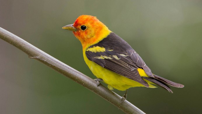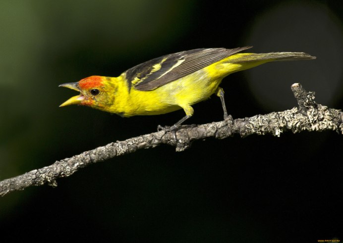 Птица с красной головой и желтыми крыльями